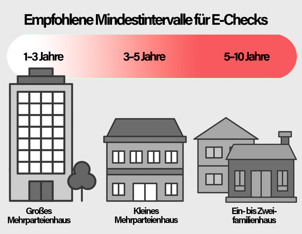 Wir empfehlen einen E-Check für große Mehrparteienhäuser jedes Jahr oder maximal alle drei Jahre. Ein kleines Mehrparteienhaus kann drei bis fünf Jahre zwischen E-Checks vergehen lassen, und ein Ein- oder Zweifamilienhaus sogar fünf bis zehn Jahre.